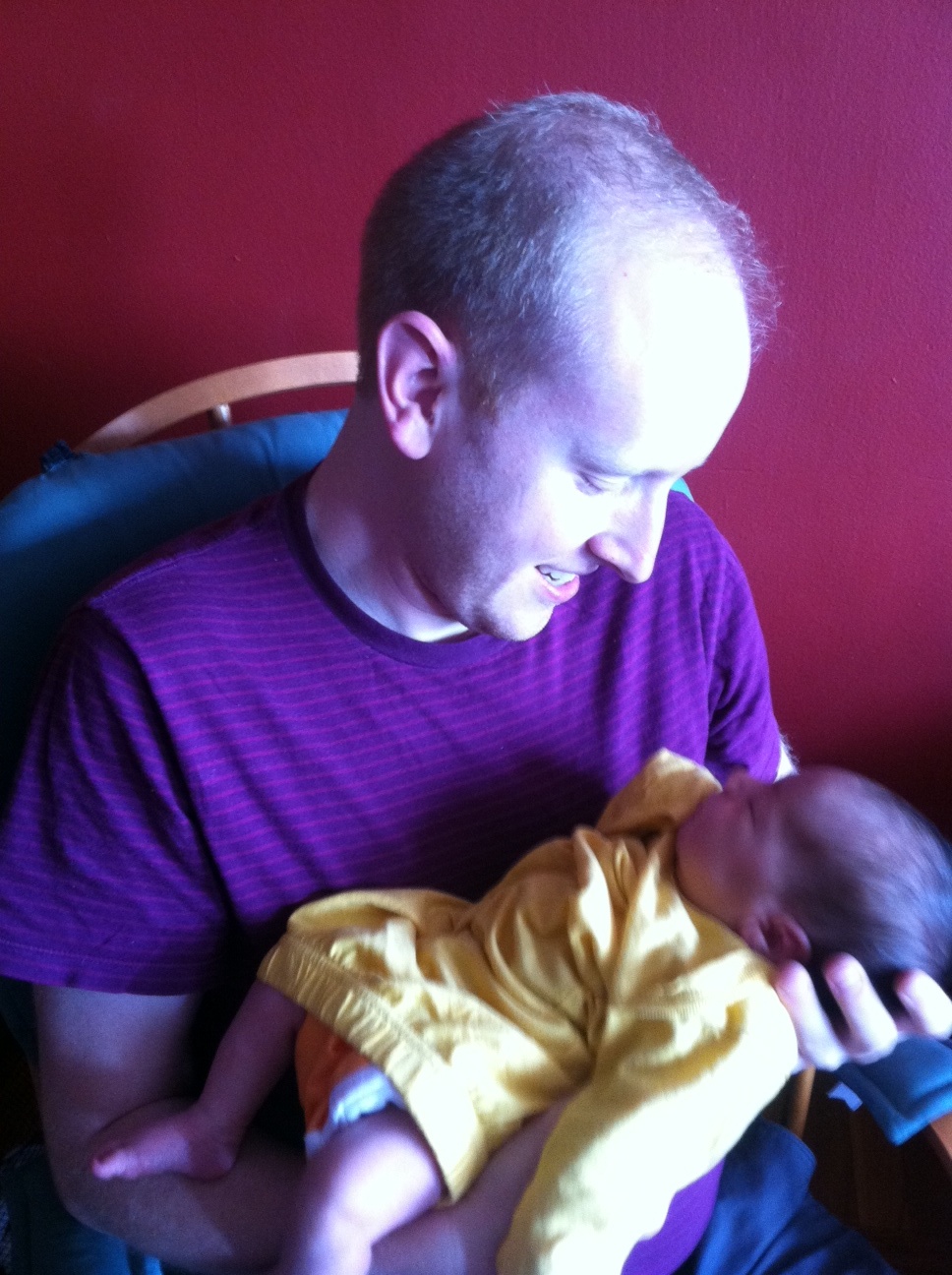 - Our early morning sleep position (where I’m desperately buying Heather some pre-dawn sleep hours) is lying on the couch with her nestled in the nook of my left side–she seems to find my heart beat soothing.
