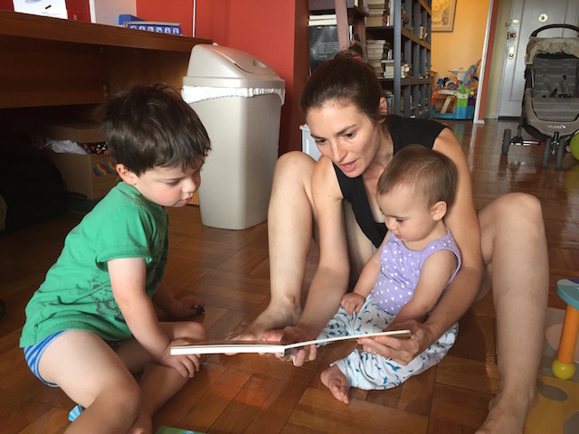 A quick two-day update: the Sunday after Mercena’s first birthday was our chance to spend some extended time with Cousin Robert, Aunt Sarah, and Uncle Allan. Robert may be going through his Terrible Threes, where the default is No first and Think later, but to Mercena, he is a wondrous creature that instantly becomes the most exciting thing in the the room. She may be more interested in playing with him than the reverse, but her definition of playing with him can simply involve proximity, so she had plenty of satisfying parallel play. The highlight of the cousin party was a bath where Robert shared his turtles with a rapturous Mercena–we were worried she wouldn’t be able to sleep from all the excitement (she did).